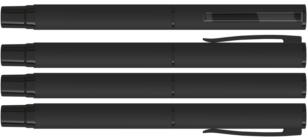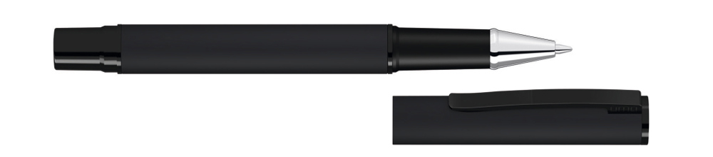 Metall-Rollerball mit Softtouch-Gehäuse und gefedertem Metallclip. Beschlagteile schwarz glänzend lackiert.