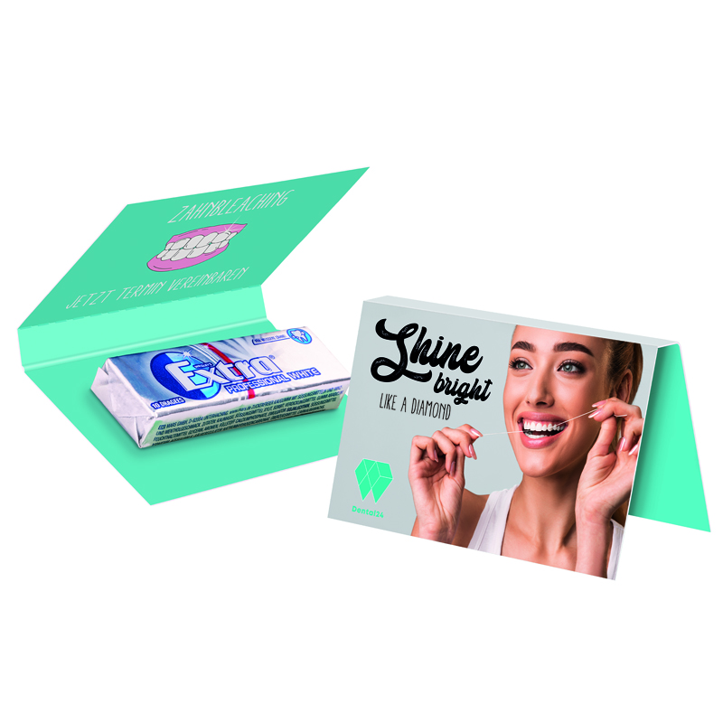 Aufklappbare Werbekarte im Visitenkartenformat, weißer Karton, mit praktischer Abreißperforation, individuell bedruckt. Inhalt: 1 Päckchen Wrigley´s Extra Professional White Kaugummi Dragees, zuckerfrei. Ab 1.080 Stück lieferbar., 14 g