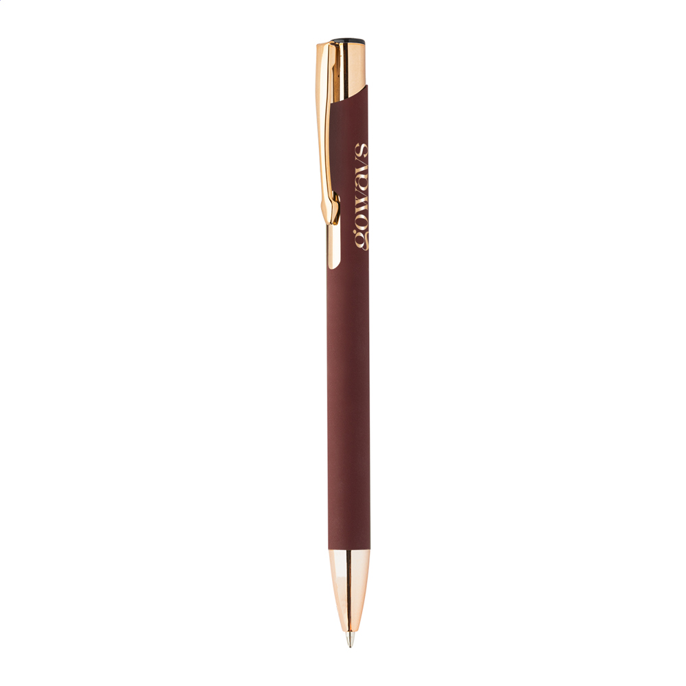 Kugelschreiber aus recyceltem Aluminium mit gummierter Oberfläche und roségoldenen Elementen. Mit Spezialbeschichtung für Spiegelgravur in Roségold, blauschreibend.