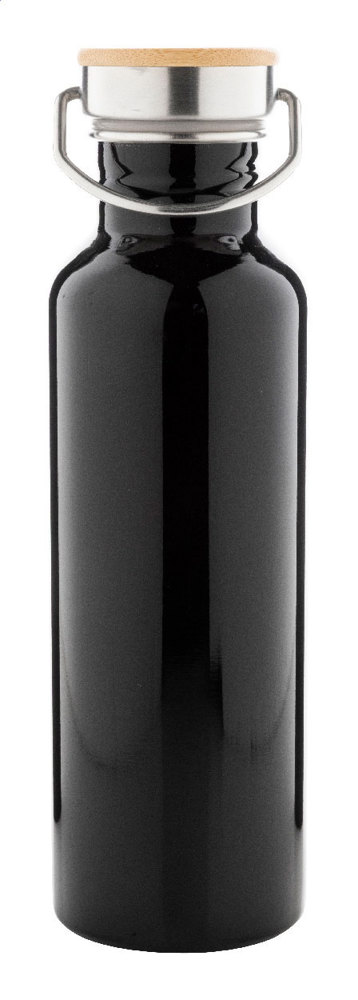 Farbige Edelstahl-Trinkflasche mit Tragedeckel aus Bambus. Füllmenge: 800 ml.