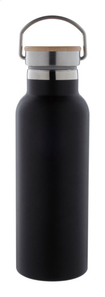 Doppelwandige, vakuumisolierte Edelstahlflasche mit Tragedeckel aus Bambus. Füllmenge: 500 ml.