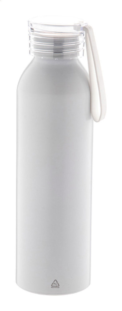 Trinkflasche aus recyceltem Aluminium mit farblich passendem Deckel und Silikontrageriemen. Füllmenge: 600 ml.