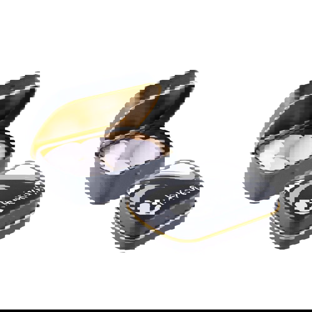 Mini Klappdeckeldose in matt dunkelblau mit goldener Innenseite und ca. 28 Gramm Mentos. Mit Vollfarbdruck, Inhaltsstoffaufkleber und Siegel.