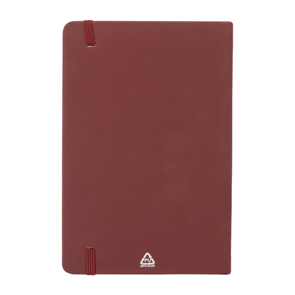 Notizbuch mit recyceltem PU-Lederbezug und 100 blanko Blättern aus Recyclingpapier. Mit farblich passendem Lesezeichen und Gummiband. A5-Größe.