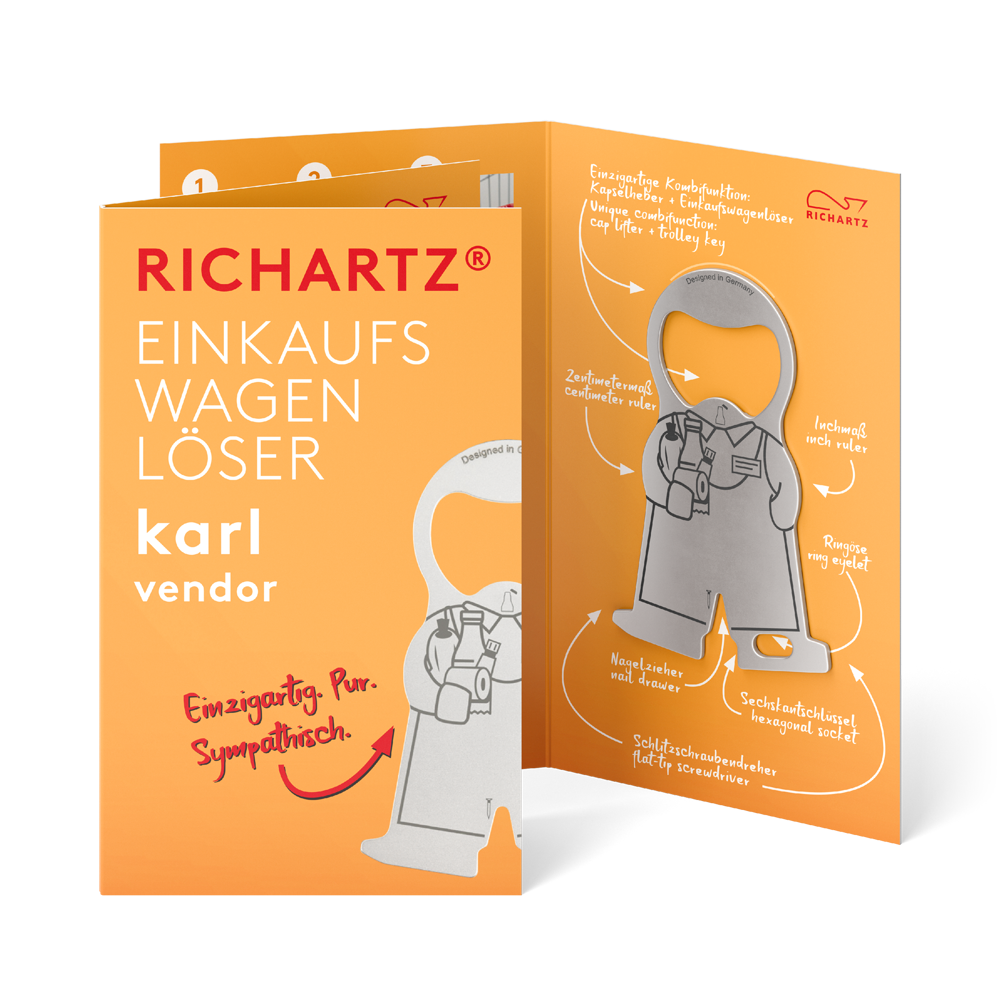 We are family, sagt Karl! In seiner EINKAUFSWAGENLÖSER-karl-Familie ist für jede Branche und für jeden Anlass dabei - auch für kleinste Zielgruppen. Unser EINKAUFSWAGENLÖSER karl selbst kommt ultraflach, handlich und mit acht Funktionen ausgestattet an jedem Schlüsselbund klar. RICHARTZ-typisch treffen hier Formschönheit auf Qualität, Funktion auf Sympathie.