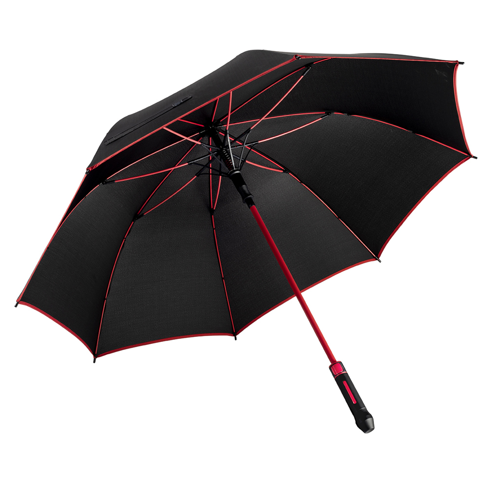 Der Regenschirm verfügt über eine Bespannung aus 190T Pongee mit farblicher Bordüre und einem Durchmesser von ca. 120 cm. Im geschlossenen Zustand ist er etwa 95 cm lang und lässt sich per Automatik öffnen. Der Schirm besteht aus 8 Segmenten und ist mit 68 cm langen Fiberglasspeichen sowie einem 14 mm Fiberglas-Schaft in der Farbe der Bespannung ausgestattet. Zudem bietet der Schirm eine Windproof-Funktion für zusätzliche Stabilität. Der schwarze, gummierte Kunststoffgriff kann mit seitlichem Doming veredelt werden und sorgt für einen komfortablen Halt.