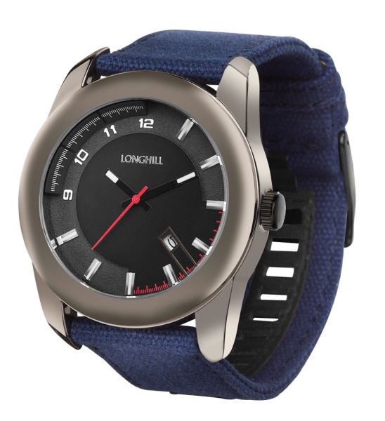 Ausstattung: Gehäusetiefe: 12 mm, Uhrwerk: PC 32 mit Datum, Zifferblatt schwarz, Index weiß, Zeiger schwarz, Sekundenzeiger rot, Gehäuseboden Edelstahl, 3 ATM water resistant , Nylonarmband 25mm blau