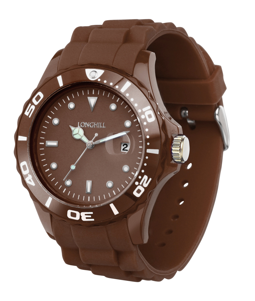 Ausstattung: Gehäusetiefe: 12,6 mm, Uhrwerk: PC 32, Zifferblatt braun mit Datum, Index Applikationen, Zeiger silber/leuchtend, Gehäuseboden Edelstahl, 3 ATM water resistant , Kunststoffarmband braun 22 mm