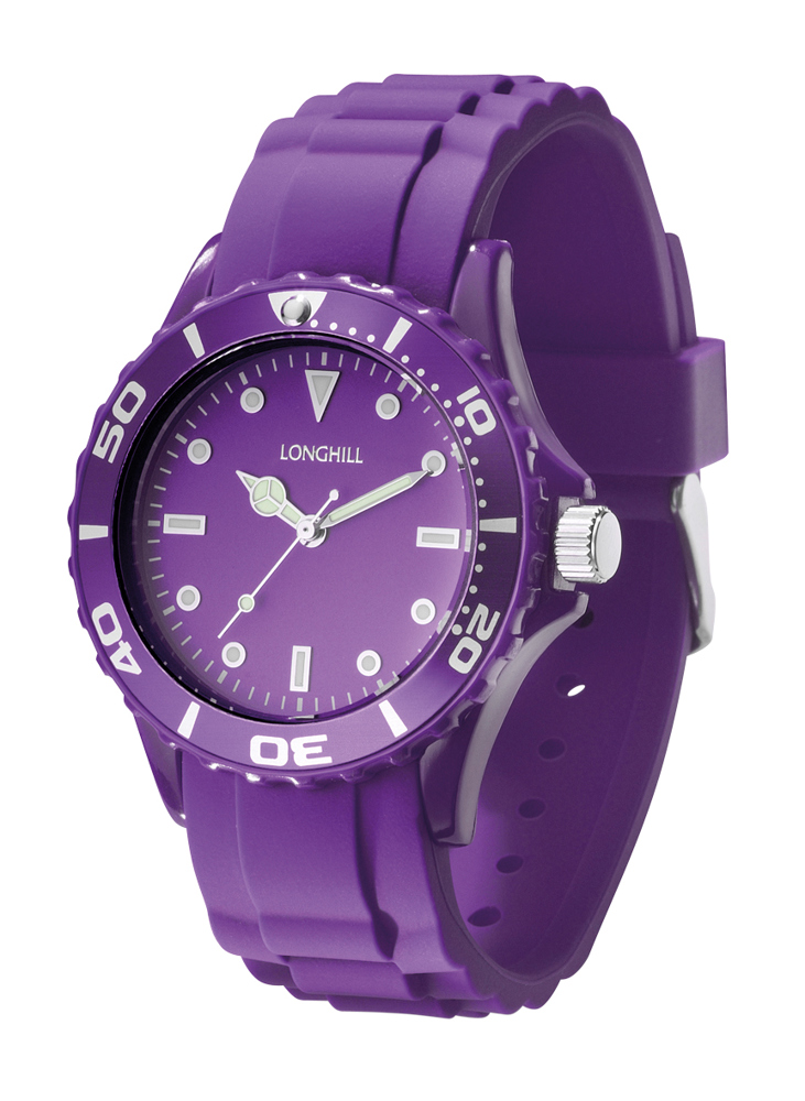Ausstattung: Gehäusetiefe: 12 mm, Uhrwerk: PC 21, Zifferblatt purple, Index Applikationen, Zeiger silber/leuchtend, Gehäuseboden Edelstahl, 3 ATM water resistant , Kunststoffarmband purple, 20 mm