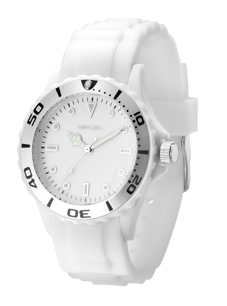 Ausstattung: Gehäusetiefe: 12 mm, Uhrwerk: PC 21, Zifferblatt weiss, Index Applikationen, Zeiger silber/leuchtend, Gehäuseboden Edelstahl, 3 ATM water resistant , Kunststoffarmband weiss, 20 mm