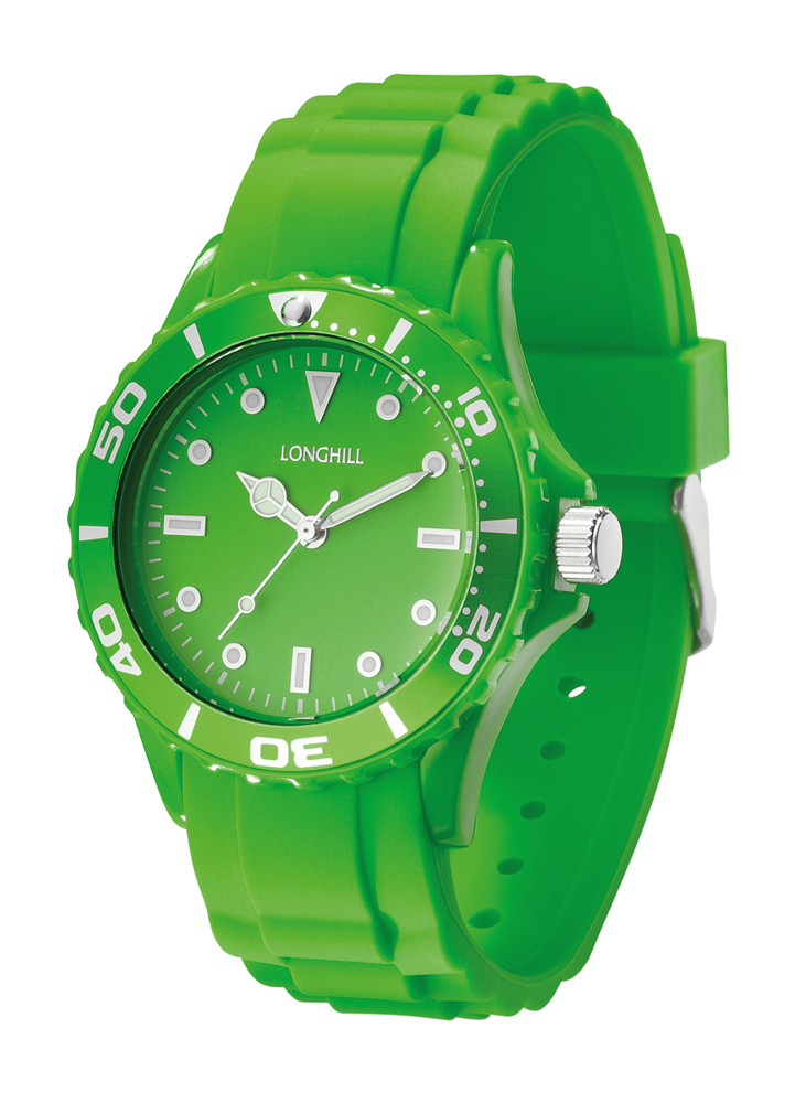 Ausstattung: Gehäusetiefe: 12 mm, Uhrwerk: PC 21, Zifferblatt grün, Index Applikationen, Zeiger silber/leuchtend, Gehäuseboden Edelstahl, 3 ATM water resistant , Kunststoffarmband grün, 20 mm