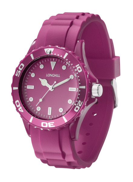 Ausstattung: Gehäusetiefe: 12 mm, Uhrwerk: PC 21, Zifferblatt brombeer, Index Applikationen, Zeiger silber/leuchtend, Gehäuseboden Edelstahl, 3 ATM water resistant , Kunststoffarmband brombeer, 20 mm