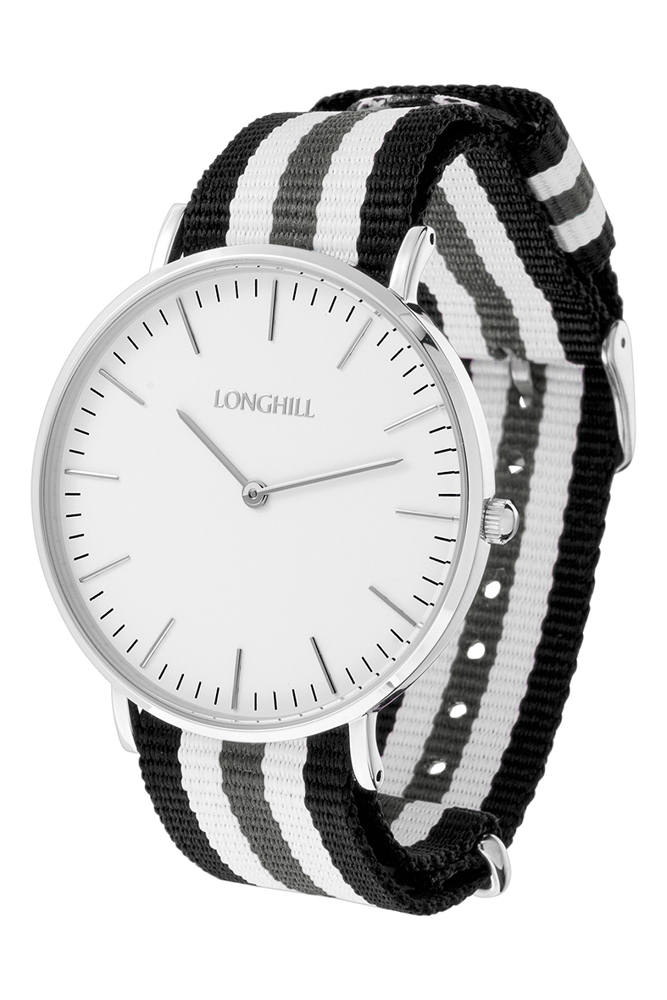 Ausstattung: Gehäusetiefe: 7,50 mm, Uhrwerk: VX50, Zifferblatt weiß, Zeiger silber, Gehäuseboden Edelstahl, 3 ATM water resistant, Textilarmband 22 mm schwarz/weiß/grau