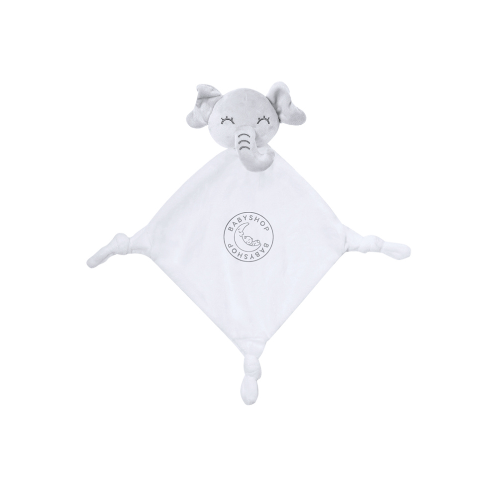 Zartes Doudou mit niedlichen weißen Elefanten Design. Mit Knoten in jeder der 3 Ecken, um den Tastsinn des Babys zu stimulieren und die Entspannung zu fördern. Hergestellt aus einem einzigen Stück Stoff, um zu verhindern, dass es in kleinere Stücke zu trennen ist.