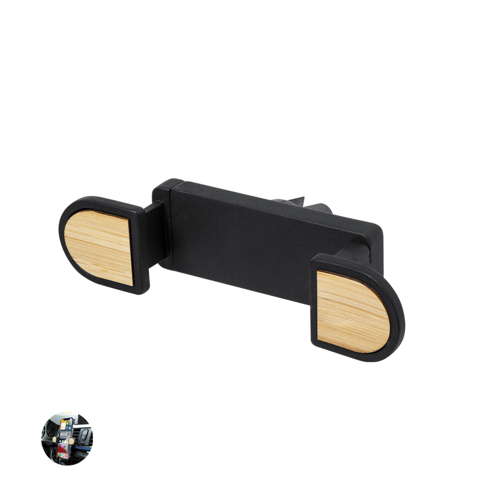 Verstellbare Smartphone-Halterung mit minimalistischem Design, 360° drehbarem Sockel und elegantem schwarzen Finish mit Bambus-Details. Mit Befestigungssystem im Lüftungsgitter des Autos und großer Beschriftungsfläche, die speziell für den Tampondruck entwickelt wurde. Präsentiert in einer Design-Kraftstoffbox. Materialien wie Bambus fördern die Verwendung von natürlichen Rohstoffen und reduzieren die Schadstoffemissionen. Es handelt sich um eine sehr widerstandsfähige und vielseitige Pflanze, die schnell wächst und sich regeneriert, was sie zu einer hervorragenden Alternative zu herkömmlichem Holz macht.