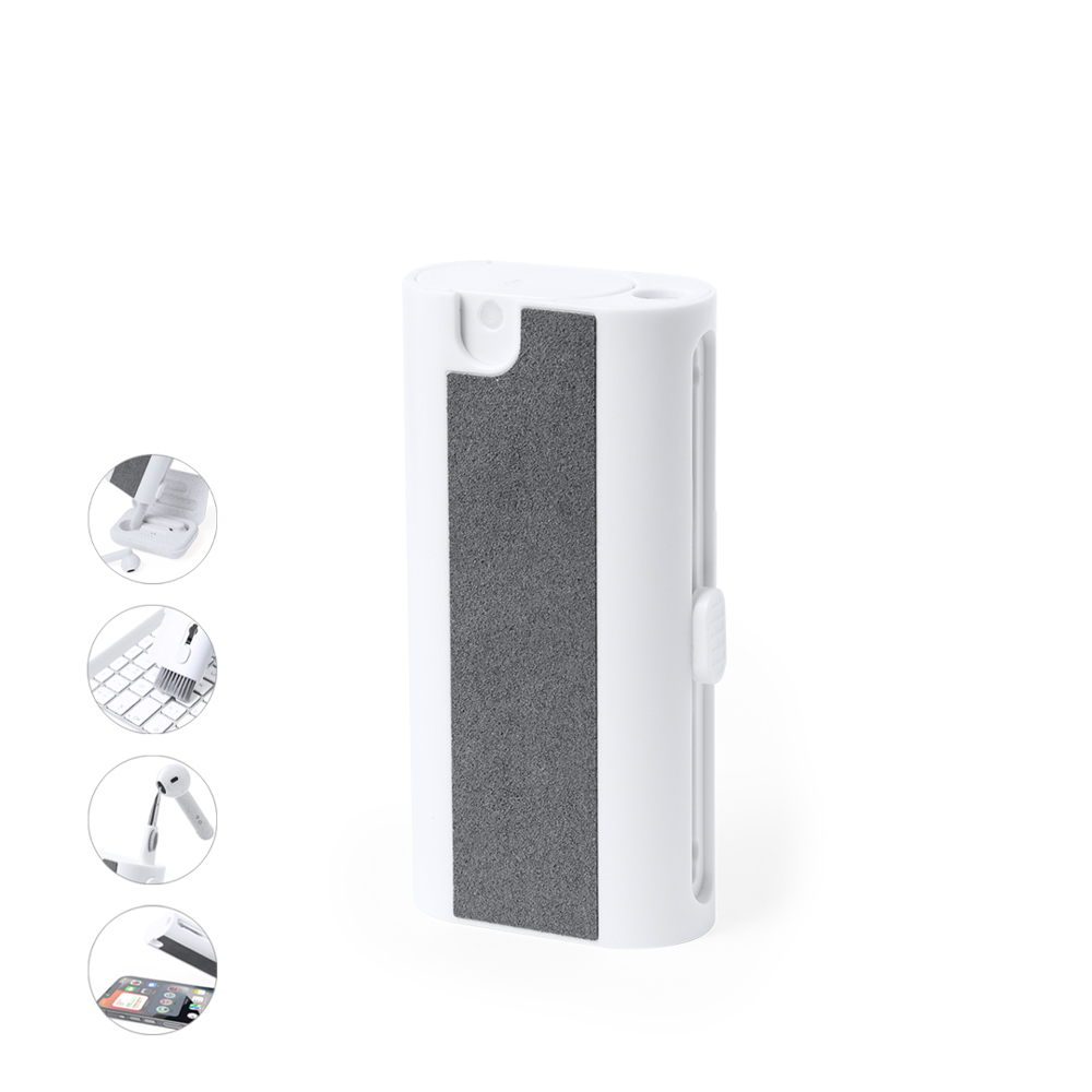 Komplettes Reinigungsset mit 6 Funktionen, speziell für die Pflege und Wartung von technischen Geräten entwickelt. Alle Zubehörteile befinden sich im Inneren des Koffers und sind durch Drücken der entsprechenden Taste einsatzbereit. Enthält einen nachfüllbaren Innentank mit Zerstäuber, einen Bildschirmreinigungsbereich, eine Metallspitze, einen Reinigungsstab, verschieden geformte Bürsten und ein Zubehör zum Entfernen des Schlüssels. Hergestellt aus widerstandsfähigem ABS, mit elegantem weißem Design und einzeln in einer Kraft-Design-Box präsentiert.