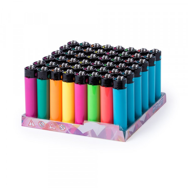 Gasfeuerzeug mit Feuersteinmechanismus. Mit Kinderschutz, nachfüllbar, Flammenregler und abnehmbarem Zubehör zum Pressen. Lieferung in Displayboxen mit 24 Einheiten und in verschiedenen, einfarbigen Farben.