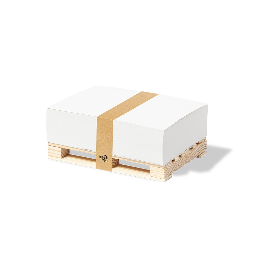 Origineller Paletten-Notizblockhalter aus Naturholz. Inklusive 300 Blatt Ökopapier und Kraftpapierhülle mit EcoPaper-Logo.
