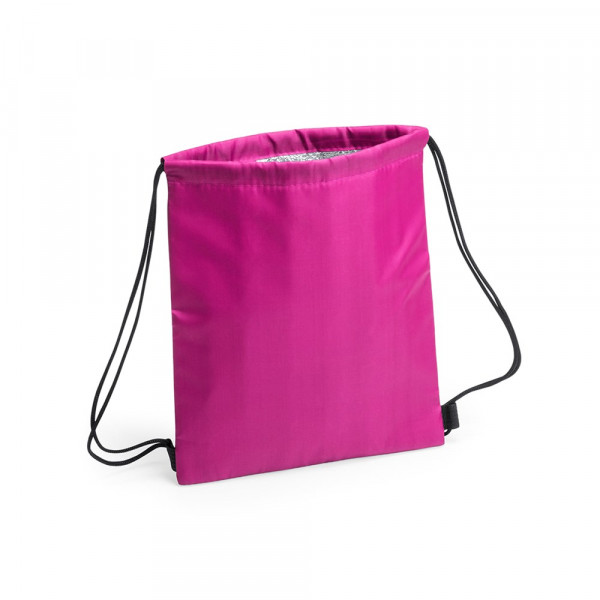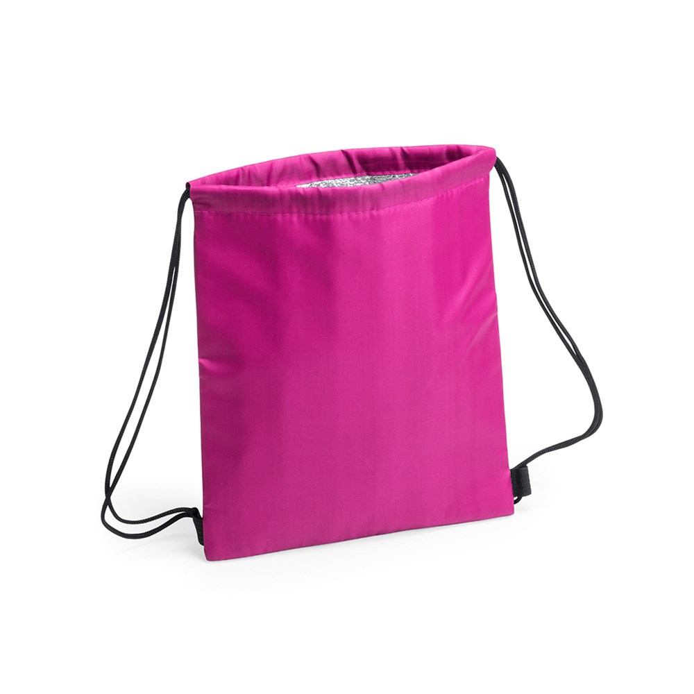 Kühlrucksack mit Kordelzug für Kinder aus weichem 210D-Polyester, in fröhlichen Farben und in einer breiten Farbpalette. Mit schwarzen selbstschließenden Seilen und verstärkten Ecken. Isotherme Innenseite in Aluminiumausführung.