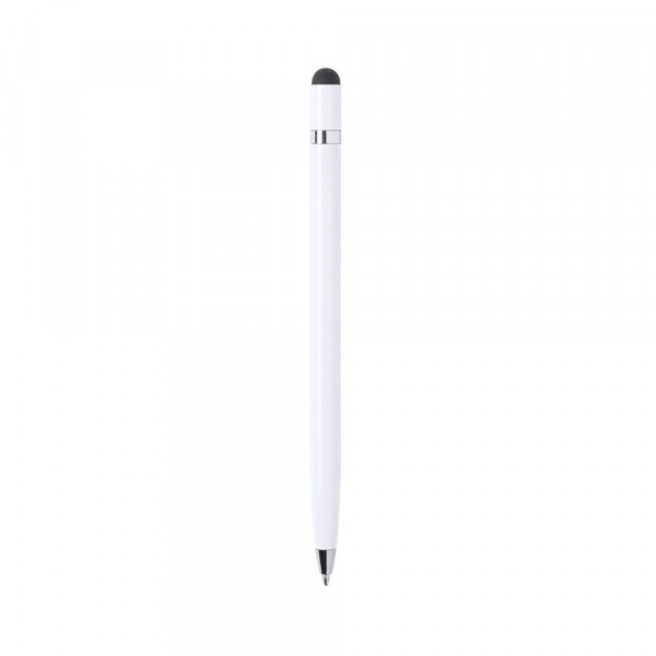 Dreh-Kugelschreiber mit Stylus aus Aluminium mit geschmeidigem Metallic-Finish und verchromtem Ring. Erhältlich in Gold, Rosa und Silber in glänzender Ausführung sowie Weiß in matter Ausführung. Blaue Tinte.