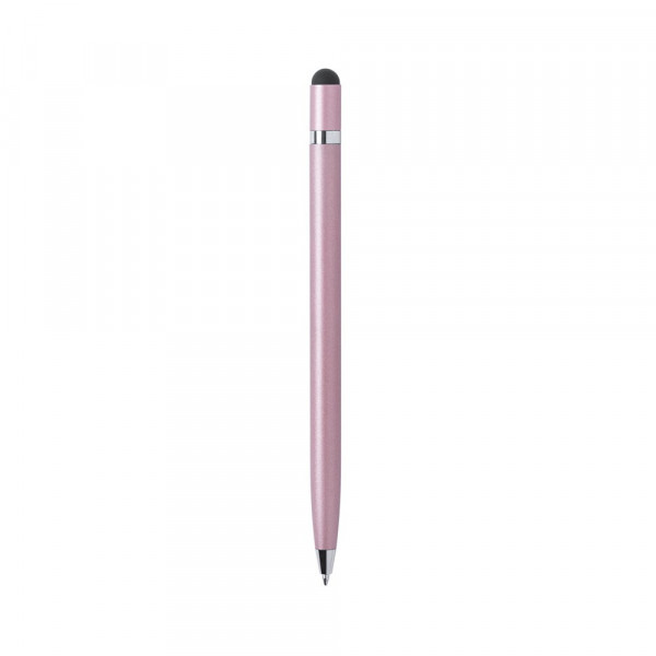 Dreh-Kugelschreiber mit Stylus aus Aluminium mit geschmeidigem Metallic-Finish und verchromtem Ring. Erhältlich in Gold, Rosa und Silber in glänzender Ausführung sowie Weiß in matter Ausführung. Blaue Tinte.