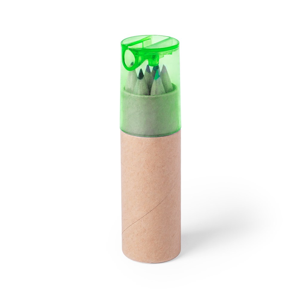 7-teiliges Set in einer zylinderförmigen Box aus Naturkarton mit transparentem Deckel in verschiedenen Farben. Enthält 6 Buntstifte mit sechseckigem Schaft in Naturfarbe und einen im Deckel integrierten Anspitzer.