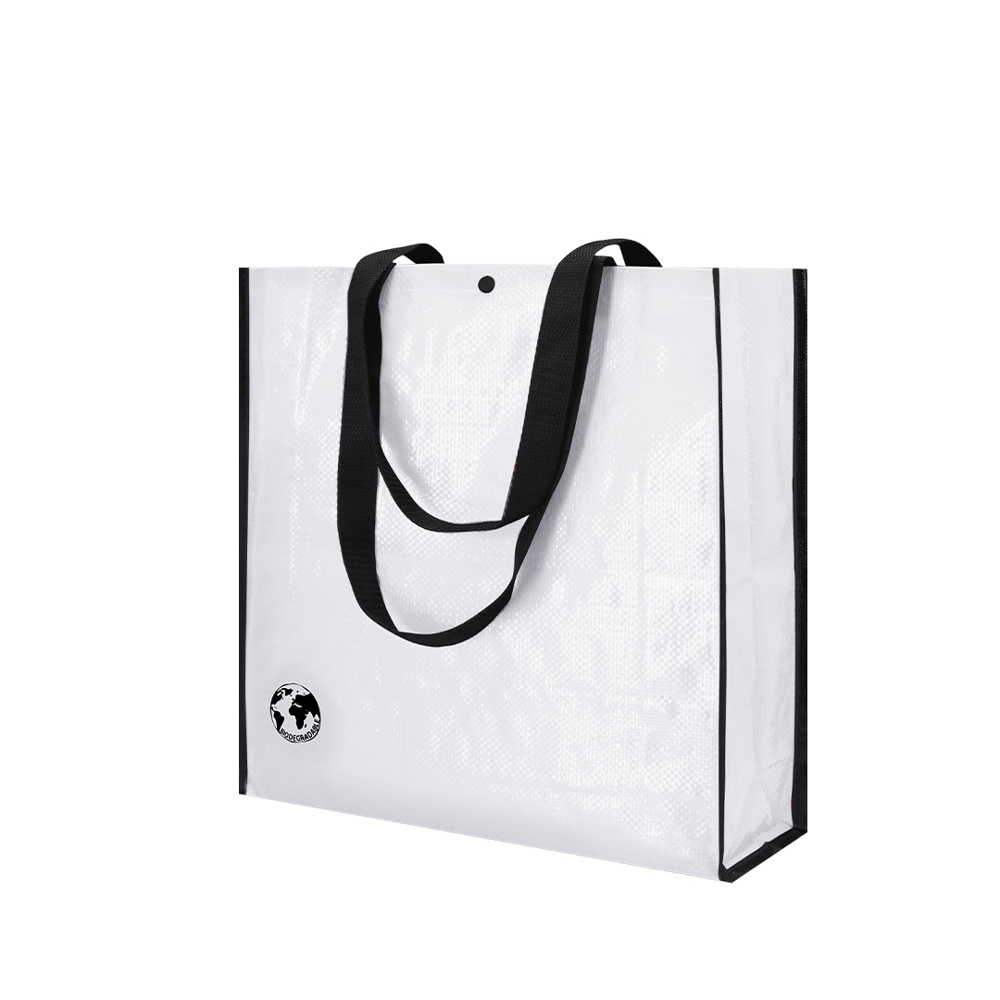 Biologisch abbaubare Tasche aus robustem, laminiertem Material in einer Vielzahl von lebendigen, glänzenden Farben. Mit 70 cm langen, verstärkten Griffen aus Nylon, verstärktem Zwickel mit Paspel sowie Druckknopf und Steppnähten. Belastbar mit bis zu 12 kg.