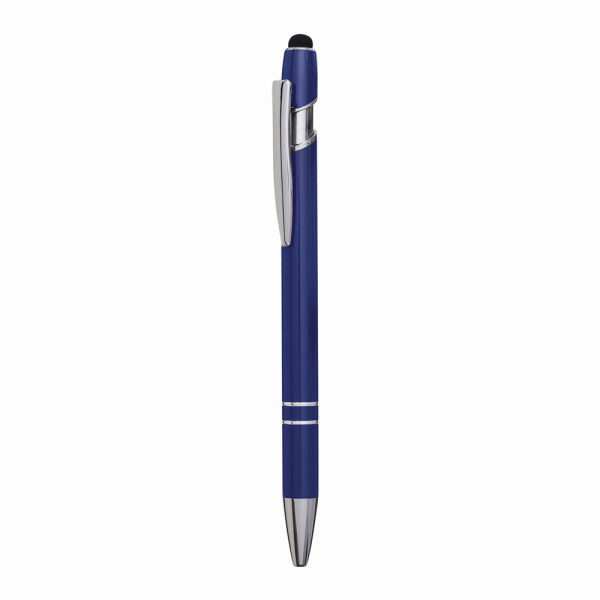 Aluminium-Kugelschreiber MERCHANT: mit glänzendem Aluminium-Schaft, Druckmechanismus, am Schaftende mit Touchscreen-Spitze, blauschreibend
