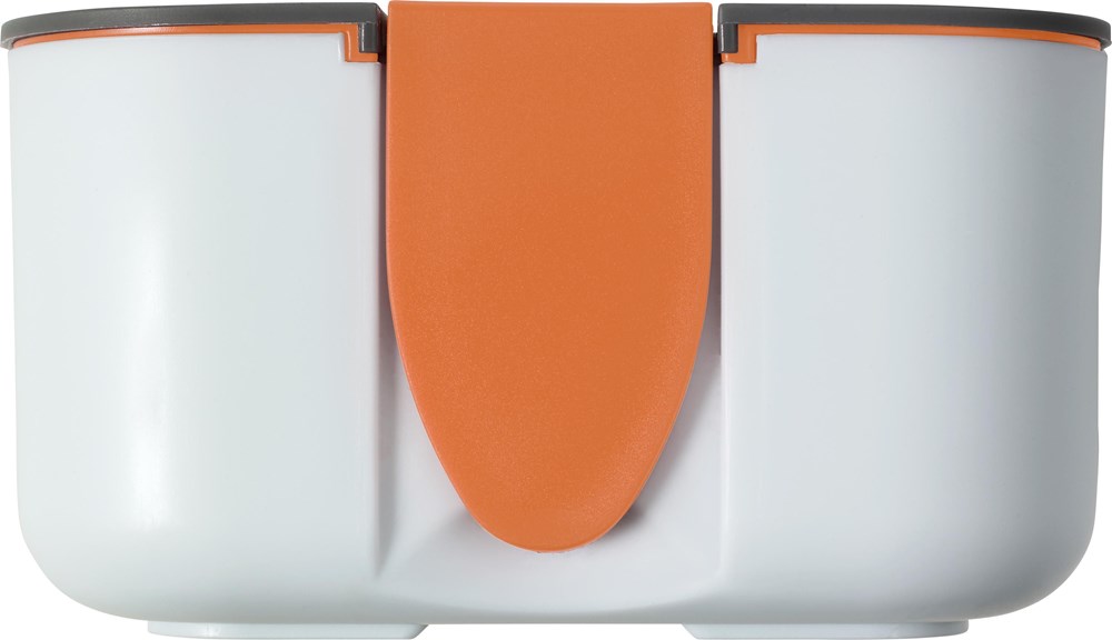 Brotdose (ca. 850 ml) aus Silikon und Kunststoff, trennbares Innenfach, mit farbigen Applikationen. Der Deckel kann als Handyhalter benutzt werden. Nicht spülmaschinengeeignet.