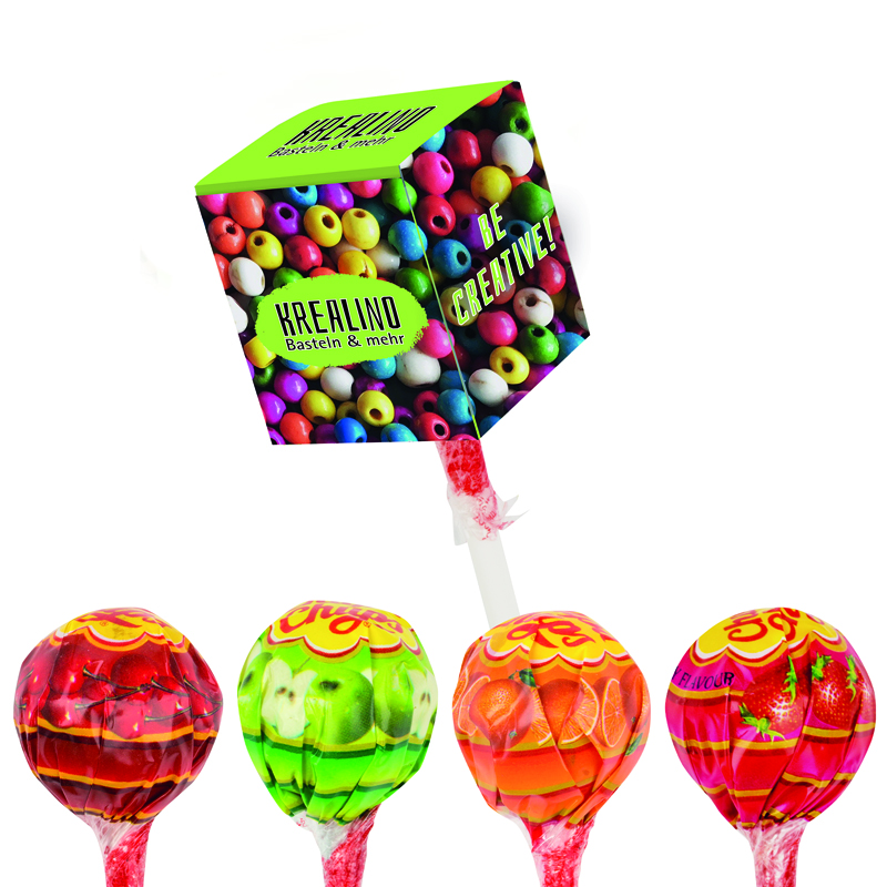 Chupa Chups Kugel Lolly in Werbebox aus weißem Karton, individuell bedruckt. Inhalt: 1 Chupa Chups Kugel Lolly, Fruchtmischung (Apfel, Orange, Erdbeere, Kirsche), 12 g
