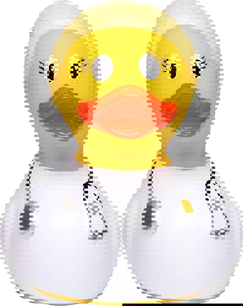 Diese flotte Ärztin ist das beste Rezept gegen Wehwechen aller Art und bringt nicht nur kleine Patienten zum Strahlen. Die 8 cm große Quietsche-Ente Ärztin trägt den klassischen weißen Arztkittel, Stethoskop und frechen blonden Pferdeschwanz. Natürlich hat auch dieses Model Geschmacksmusterschutz.