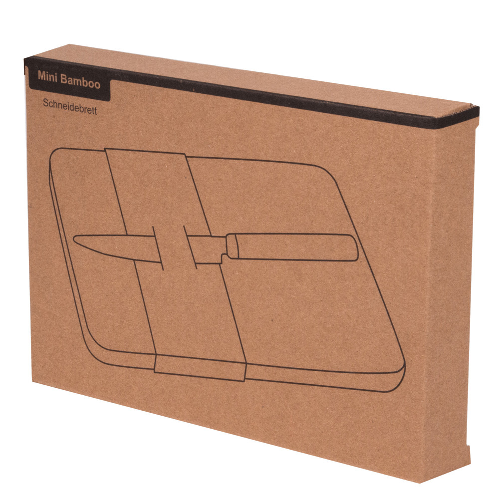 Schneidebrett MINI BAMBOO: aus Bambus, inkl. Messer mit Edelstahlklinge und Bambusgriff, Banderole aus Papier mit Einschub für das Messer, in Box