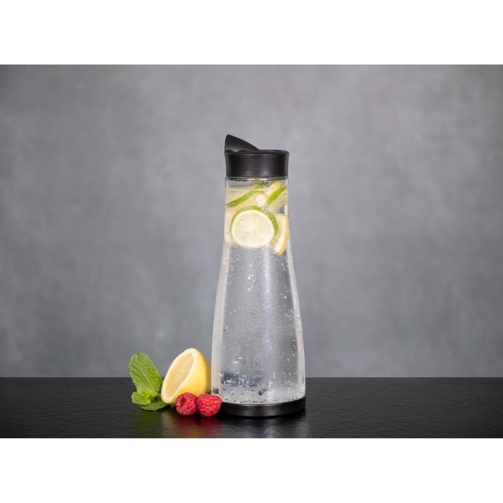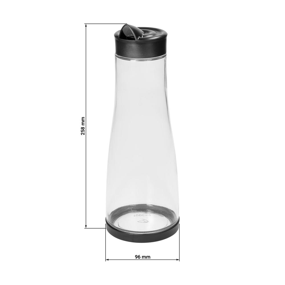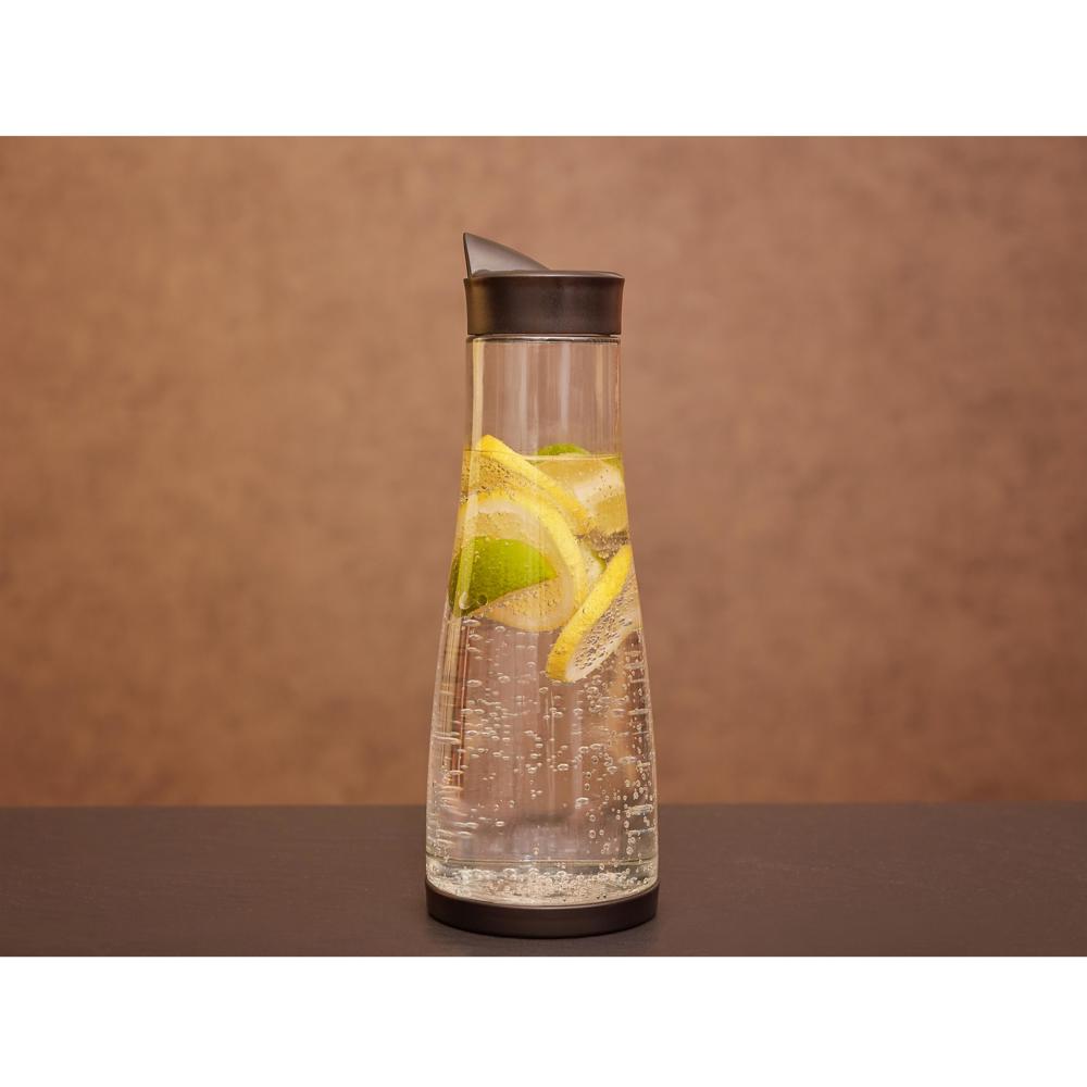 Formschöne Glaskaraffe aus Sodalime-Glas mit Ausgießer aus Kunststoff, welcher mittels Schraubverschluss sicher mit der Karaffe verbunden ist. Füllmenge: 1,0 Liter.