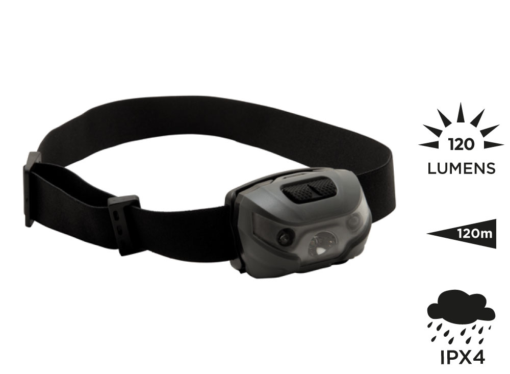 5 wählbare Beleuchtungsmodi: 3W CREE weiße LED (100%, 30% oder blinkend) und 2x 0,5W rote LEDs (100% oder blinkend). Verstellbarer Lichtstrahl. Gehäuse aus ABS-Kunststoff. Bequemes elastisches Band mit Soft-Touch-Oberfläche. Funktioniert mit 3 AAA-Batterien (im Lieferumfang enthalten). LED-Leistung: 3W (120 Lumens). Strahllänge: 120 m. Wasserdichtigkeitsniveau: IPX-4. Wird in einer Geschenkbox geliefert.