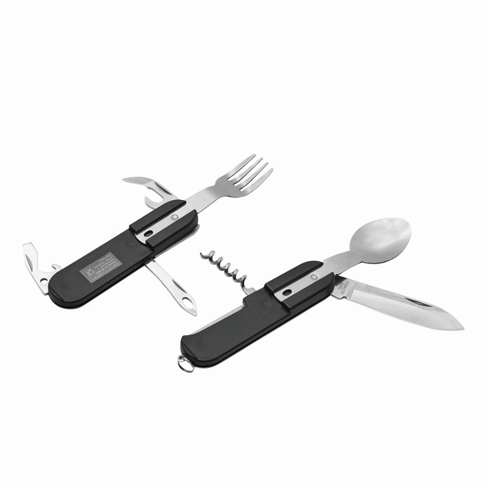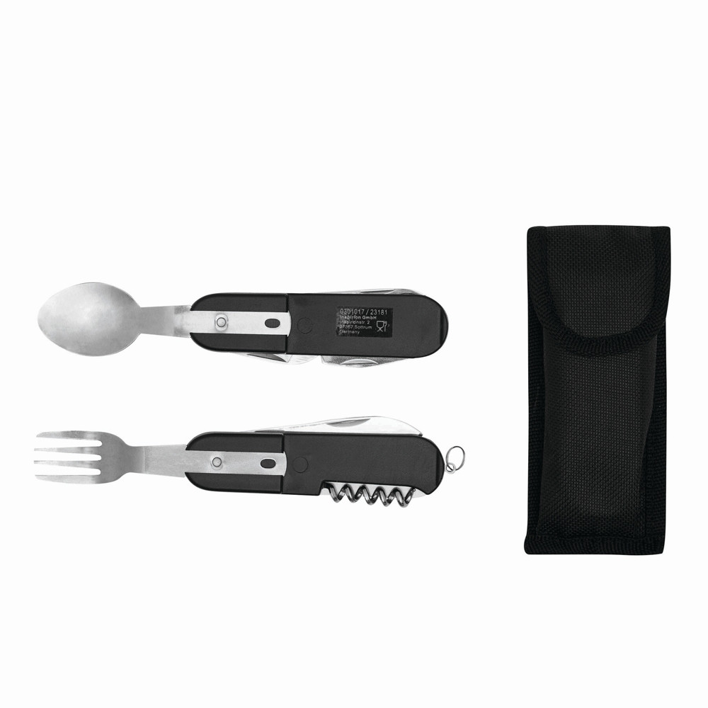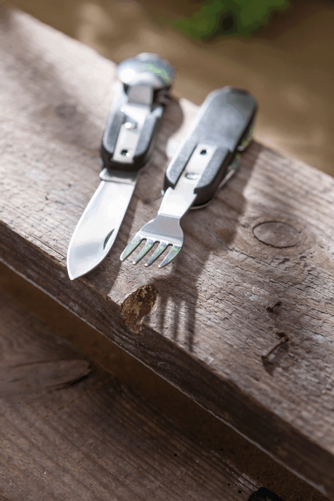 Edelstahl-Multifunktionswerkzeug WILDLIFE: mit ausklappbarem Messer, Flaschen- und Dosenöffner, Entschupper und Korkenzieher, ausziehbarer Gabel und Löffel, mit Schlüsselring, in Tasche mit integrierter Gürtelschlaufe und Klettverschluss – ideal für Camping, Picknick und Outdooraktivitäten, in Box