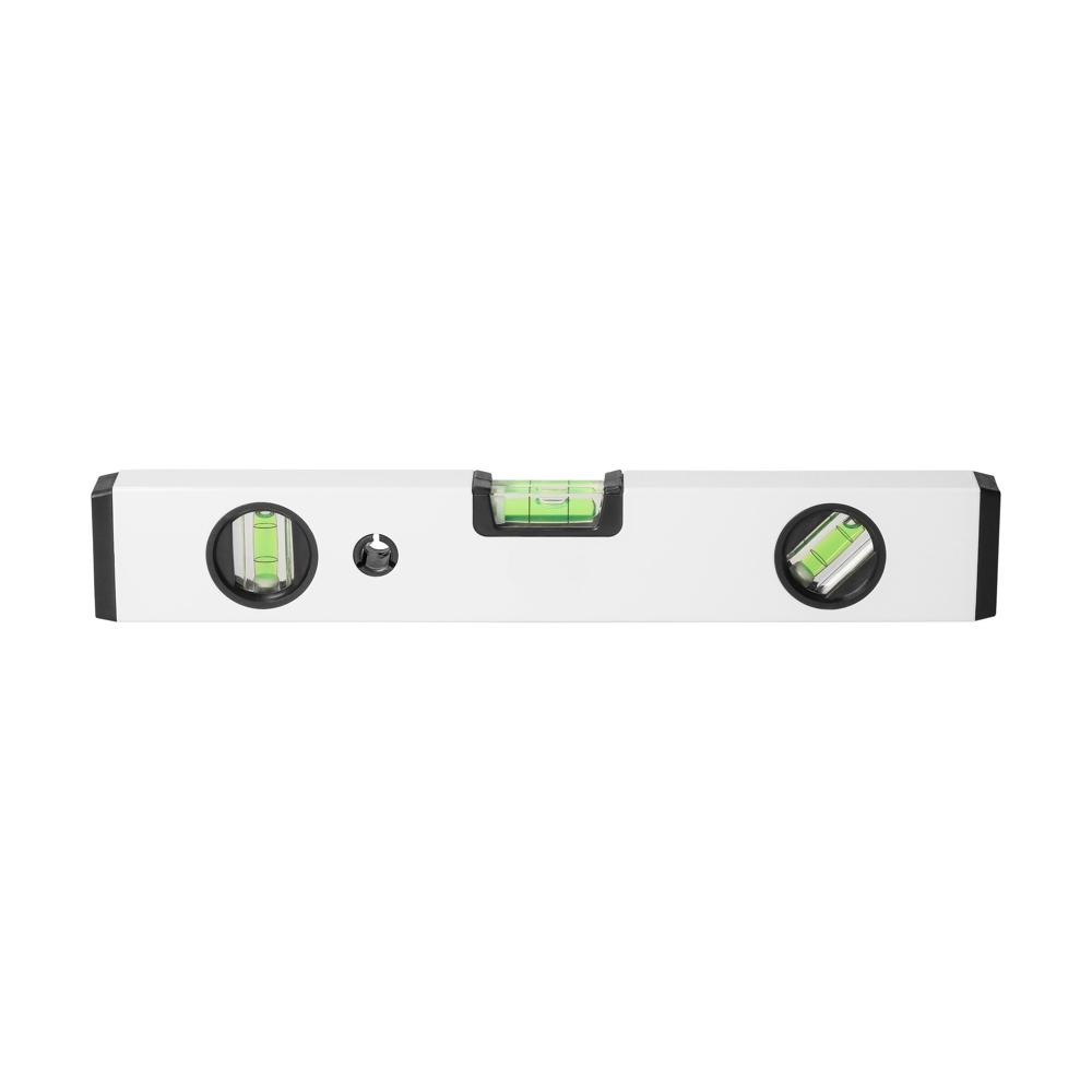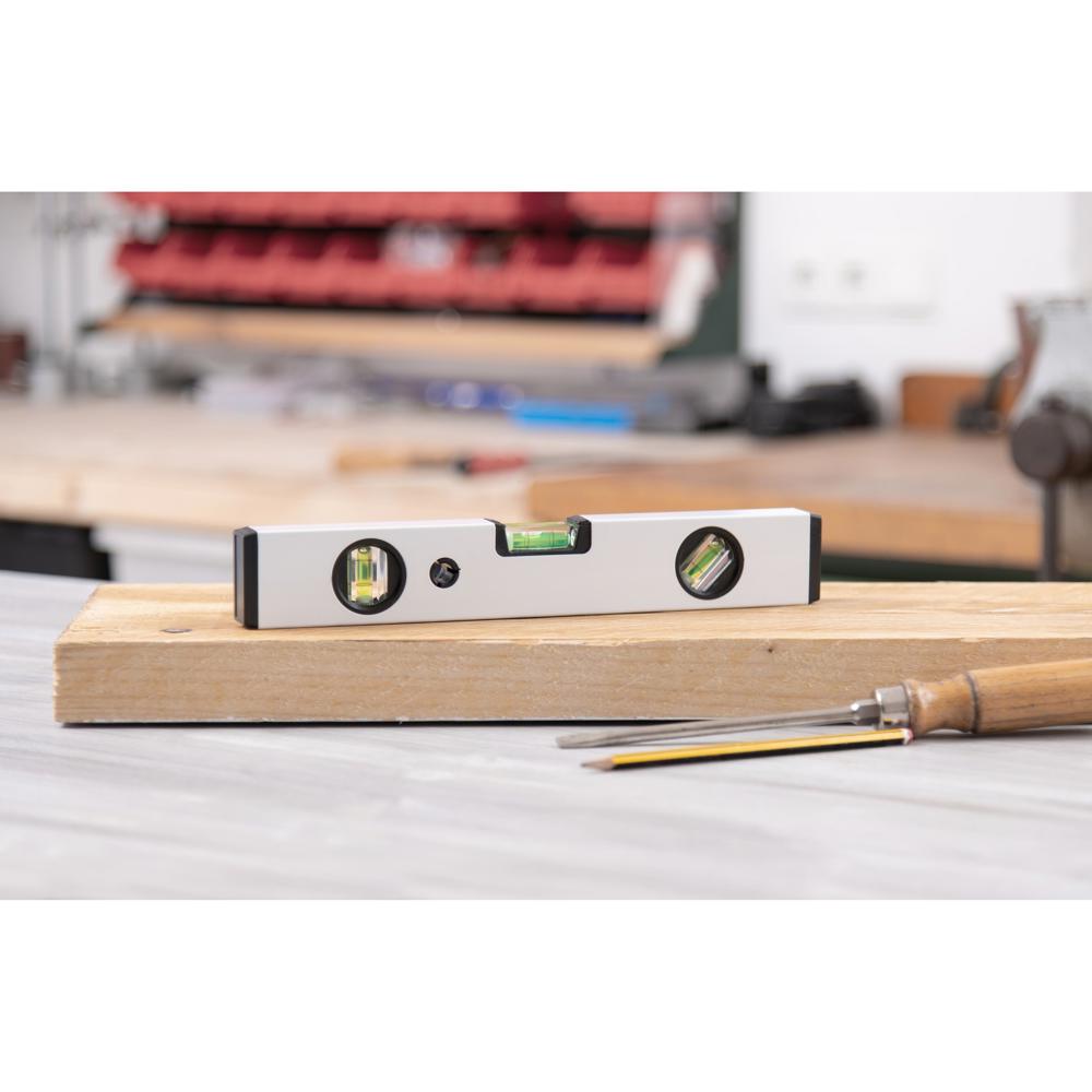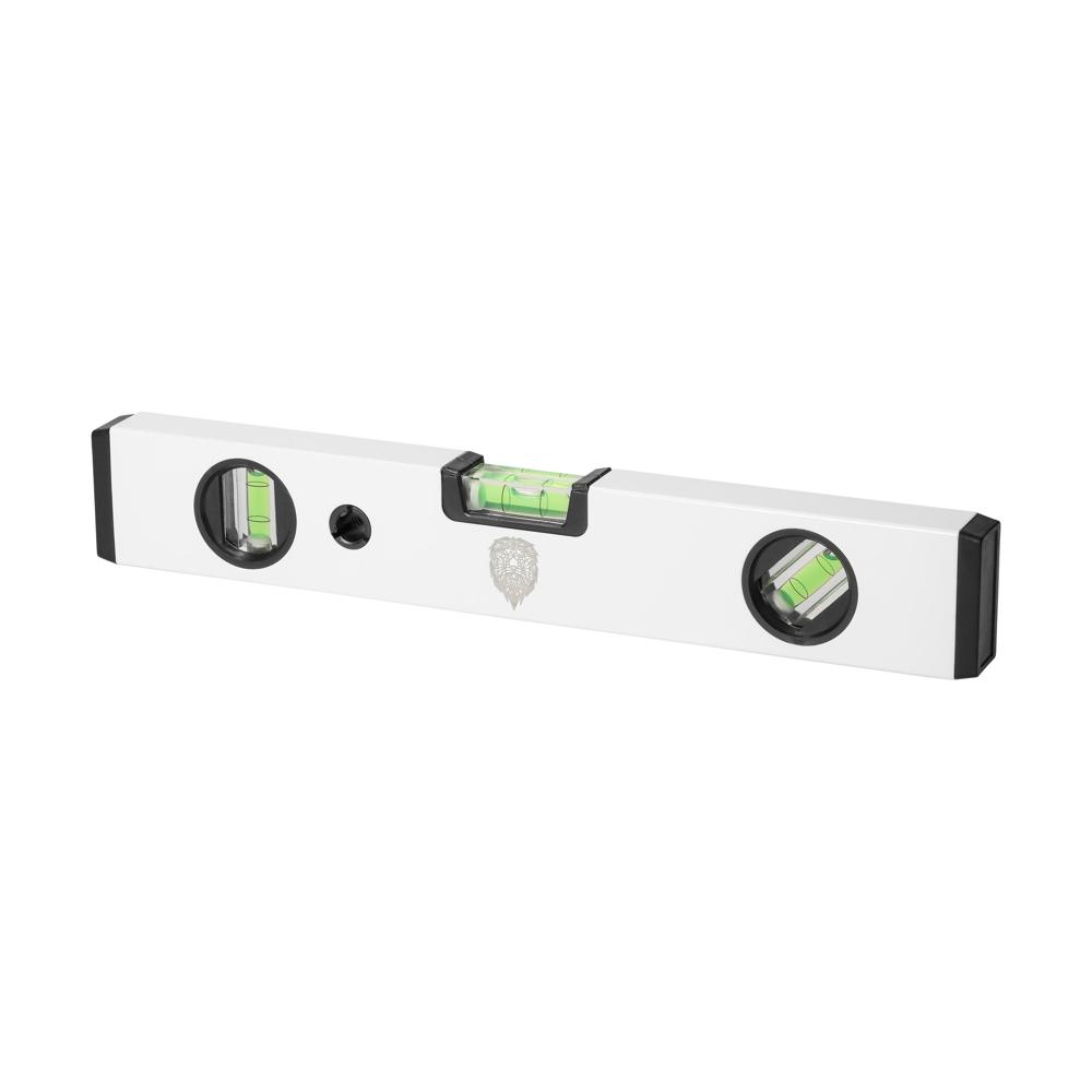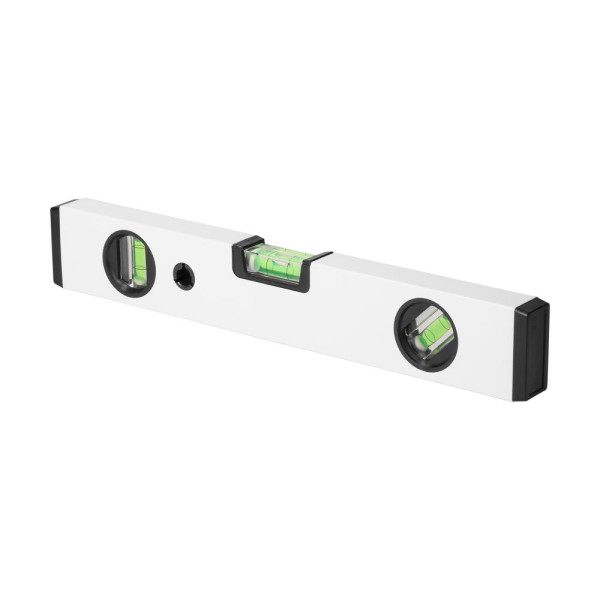 Leichte Wasserwaage aus Aluminium mit einer Länge von 30 cm. Versehen mit Kunststoff-Endkappen, die das Profil bei Schlägen schützen. Mit einer horizontalen, vertikalen und 45 Grad Libelle für sämtliche Messanforderungen und einem kleinen Loch zum einfachen Aufhängen. Einfach zu Reinigen dank der glatten Seitenflächen.