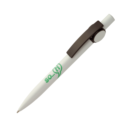 Der LOLLAND Kunststoff-Kugelschreiber Peekay ist ein weißer Design-Werbekugelschreiber mit einem farbigen, breiten und geschwungenen Clip und markanten Clip-Dekoren. Der Kugelschreiber wird mit einer blau schreibenden Parker-System-Langschreibmine geliefert.