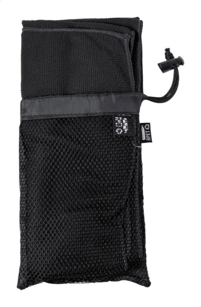 Sporthandtuch aus Mikrofaser mit RPET-Beutel und abtrennbarem RPET-Label. Material: RPET-Polyester (160 g/m²).
