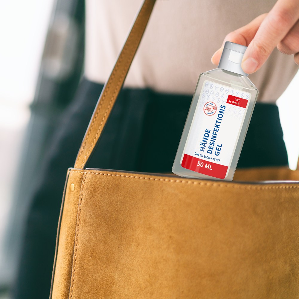 Hände-Desinfektionsgel, 50 ml Flasche mit Klappdeckel.
