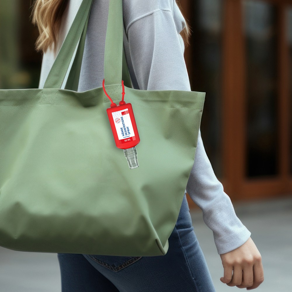 Hände-Desinfektionsspray (DIN EN 1500), 50 ml Bumper rot, Body Label (R-PET)