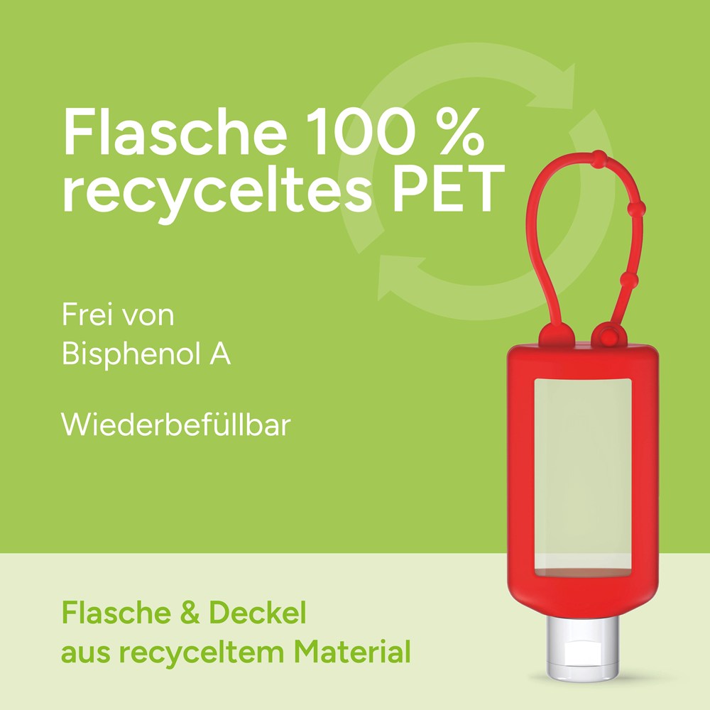 50 ml Flasche aus 100% recyceltem PET, transparent mit leichter R-PET-Färbung. Mit Klappdeckel "weiß" aus recyceltem PP, zufällig ausgerichtet; Silikonhülle und Schlaufe in rot. Nachfüllbar.